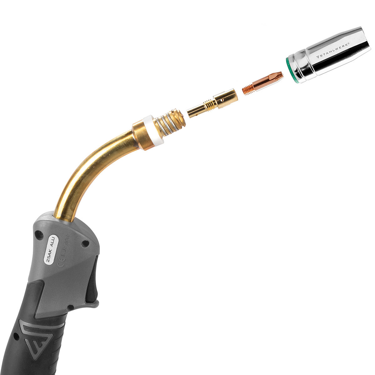 - The AK25/MB25 MIG MAG welding torch fits comfortably in the hand and enables low-fatigue welding of aluminum over a long period of time.