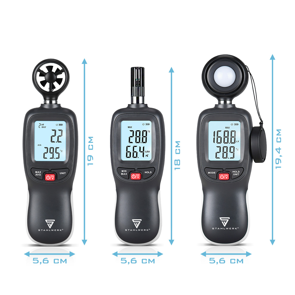 - Climate and light measuring set with three practical measuring devices in one package: Provides a direct overview of air movements, room climate and light conditions.