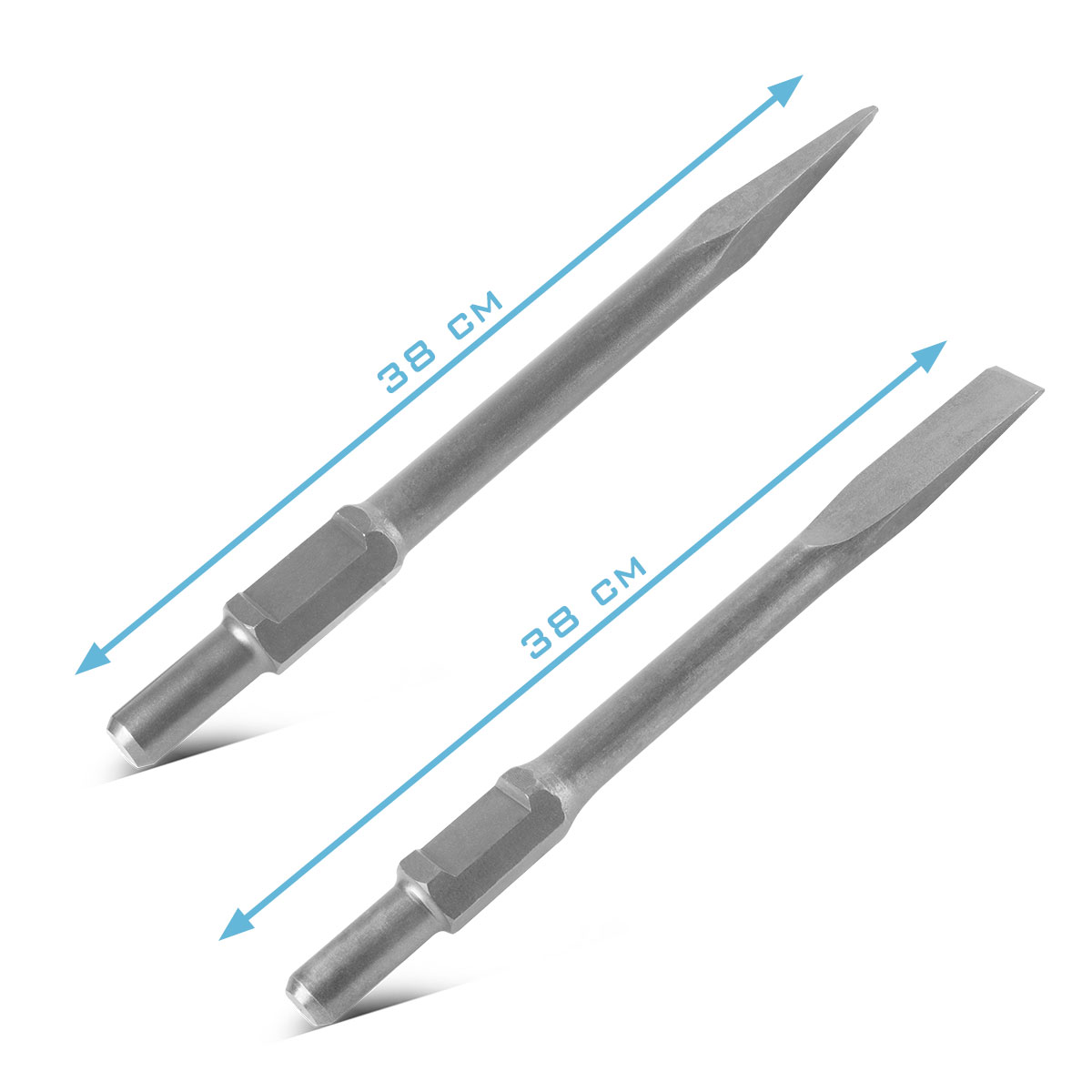 - Mejselsættet i høj kvalitet består af to flade mejsler og to spidse mejsler med en længde på 380 mm.