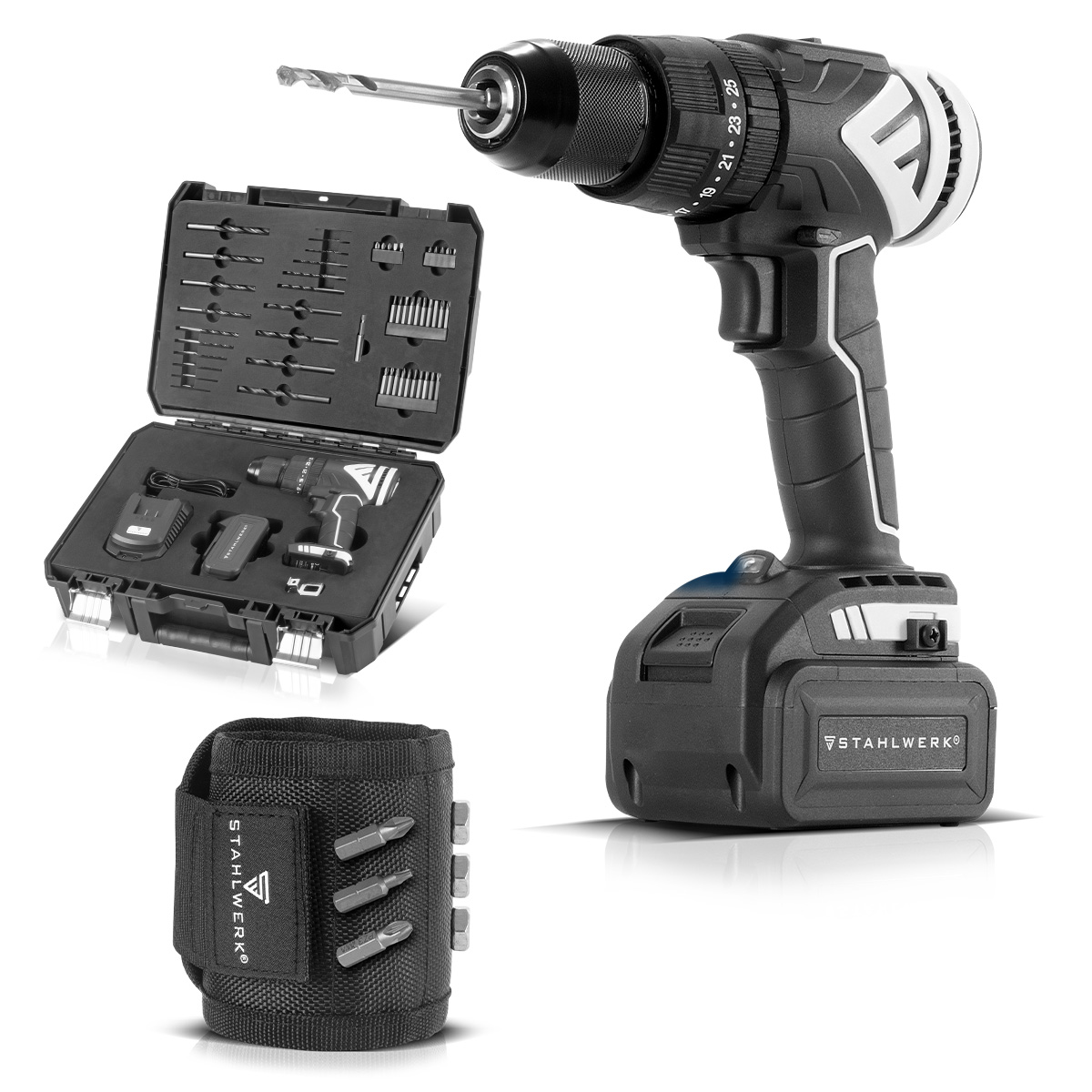 - Akkuporakone, jossa on kotelo, ladattava akku ja magneettinen rannehihna: Täydellinen yhdistelmä kunnianhimoisille DIY-harrastajille. Setti koostuu tehokkaasta ASB-20 ST -akkuiskuporakoneesta ja käytännöllisestä magneettisesta rannehihnasta ruuveille ja pienille osille.