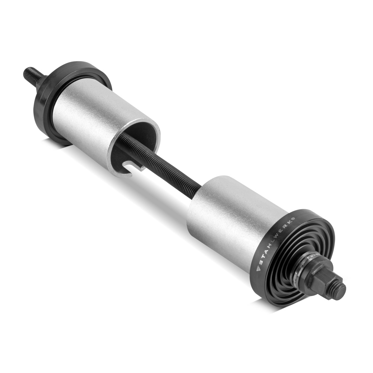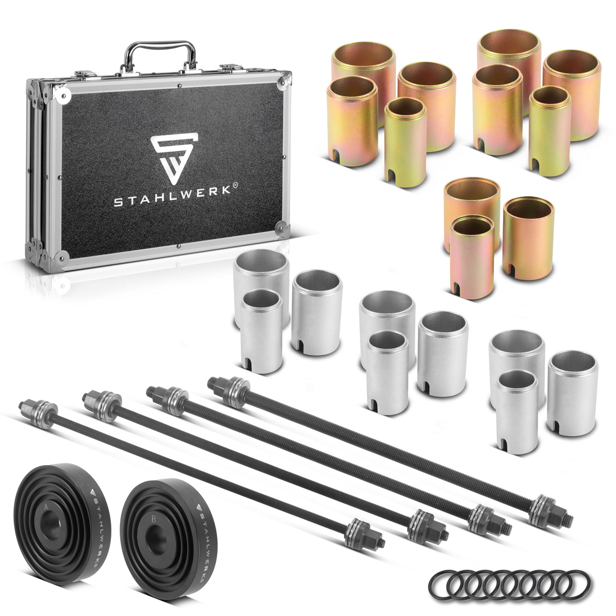- 27-osainen holkkilaakerin ulosvetosarja on ihanteellinen pyöränlaakereiden ja jousitusholkkien ammattimaiseen asentamiseen ja irrottamiseen.