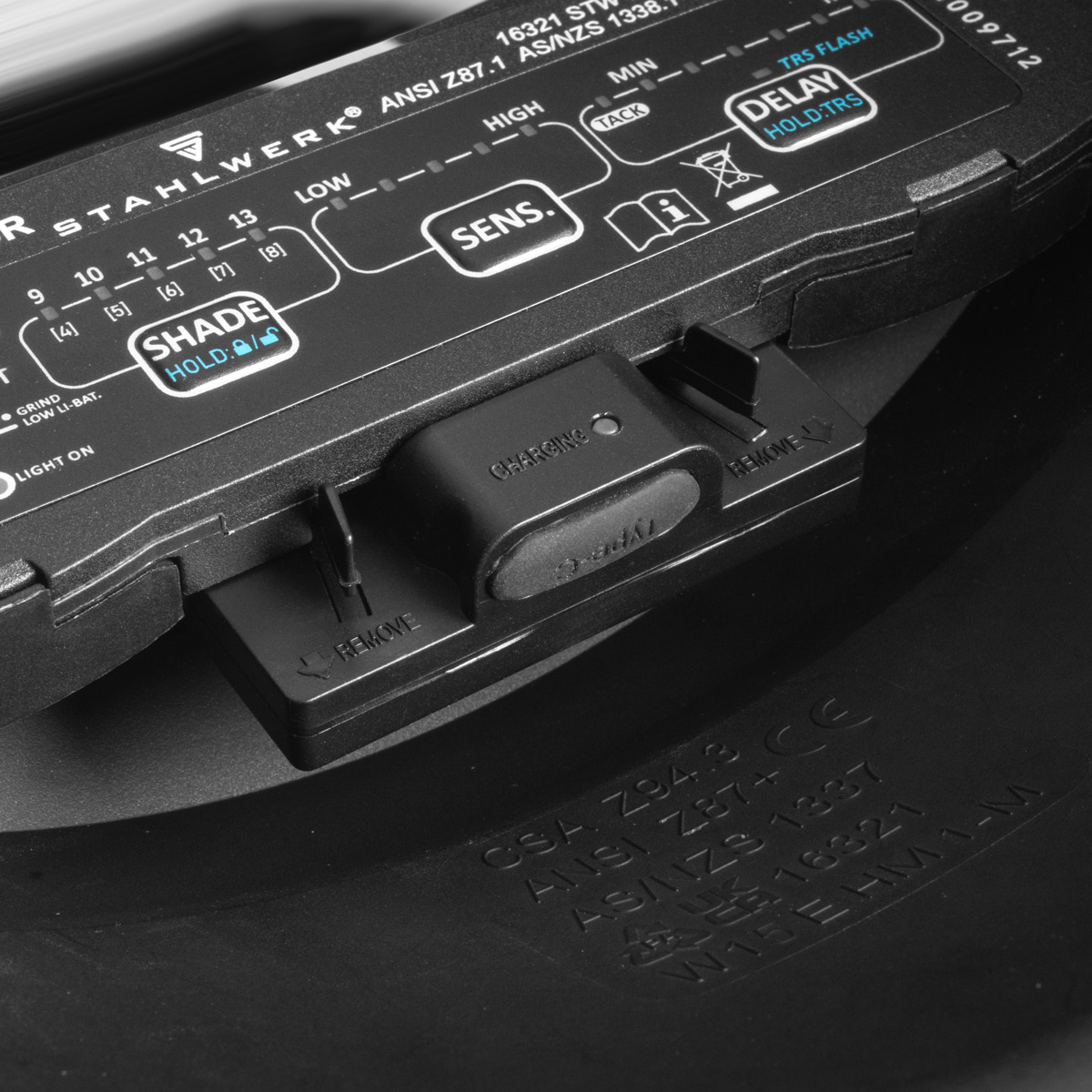 - Praktyczny moduł bateryjny z akumulatorem LI-ion do jasnej, ładowalnej latarki czołowej LED przyłbicy spawalniczej RAPTOR do oświetlania miejsca pracy.