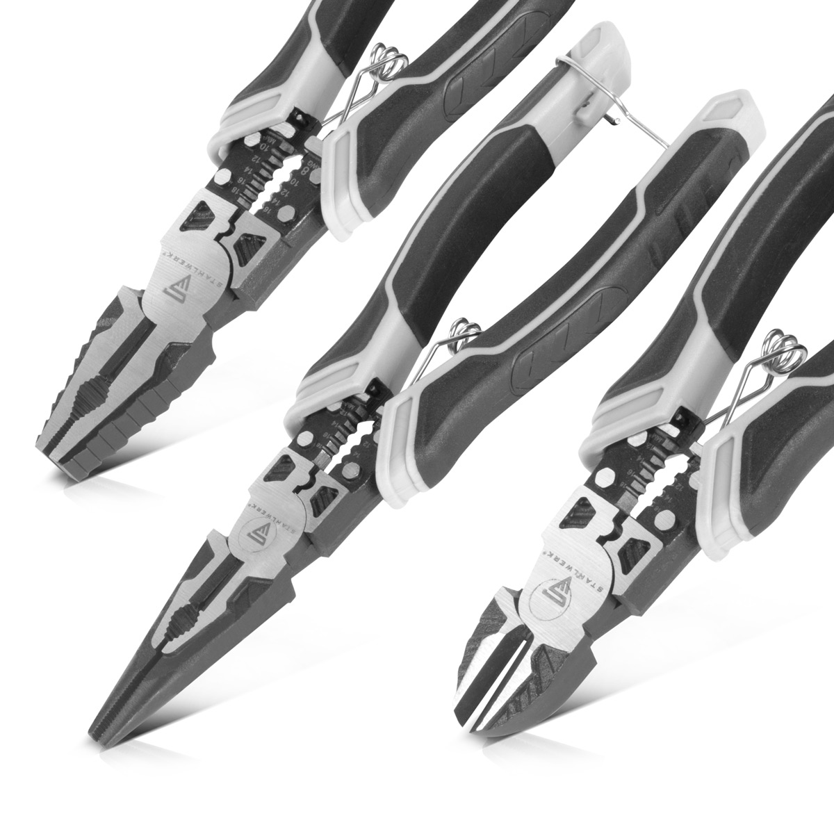 - De veelzijdige tangenset bestaande uit een combinatietang, schuin- en rondsnijtang is perfect voor professioneel gebruik in de industrie, handel en doe-het-zelf.