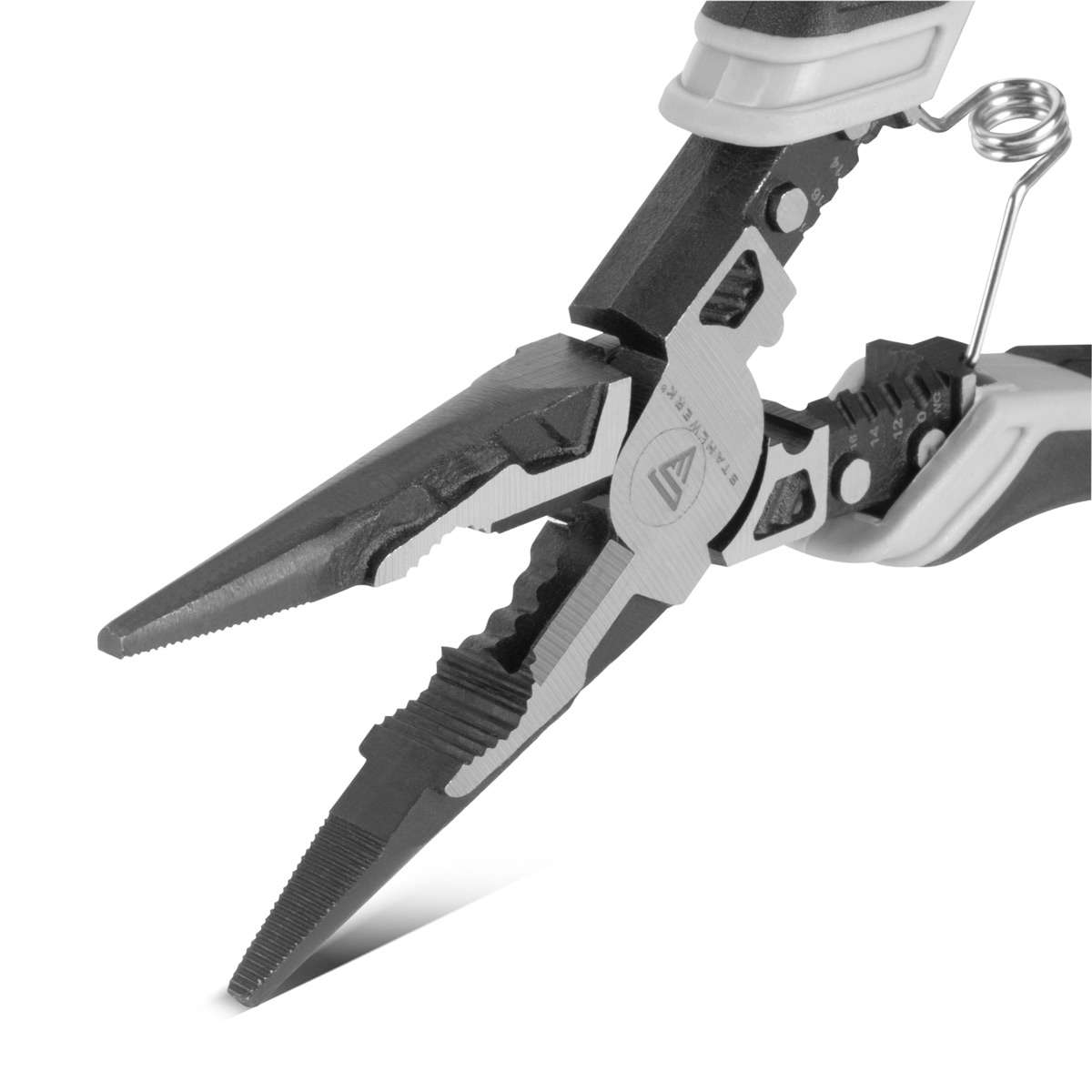 - Den alsidige rundtang kombinerer mange funktioner i bare én tang. Multifunktionstangen kan bruges som nåletang, sideskærer, afisoleringstang eller krympetang.