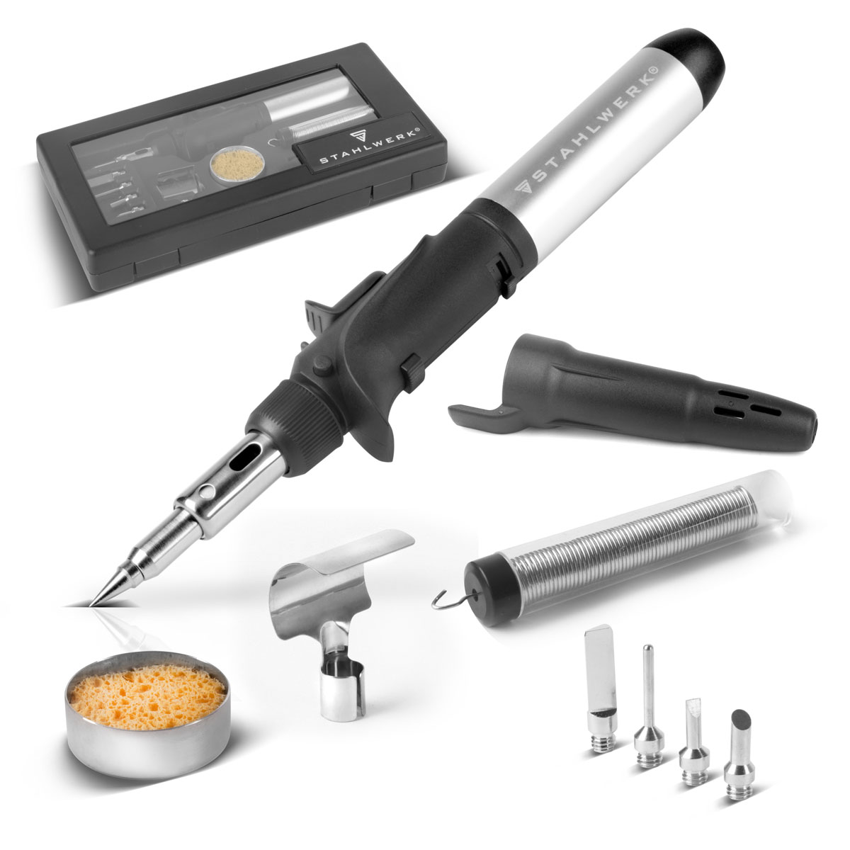 - Rozsáhlá 10dílná sada páječek nabízí vhodné příslušenství pro každé použití. Díky různým pájecím hrotům a nástavcům (kovadlinkový hrot | sekáčový hrot | nožový hrot | jehlový hrot | deflektor) je přístroj kromě pájecích a odpájecích prací vhodný pro smršťování, řezání, řezání za tepla, tavení, značení a mnoho dalších aplikací.