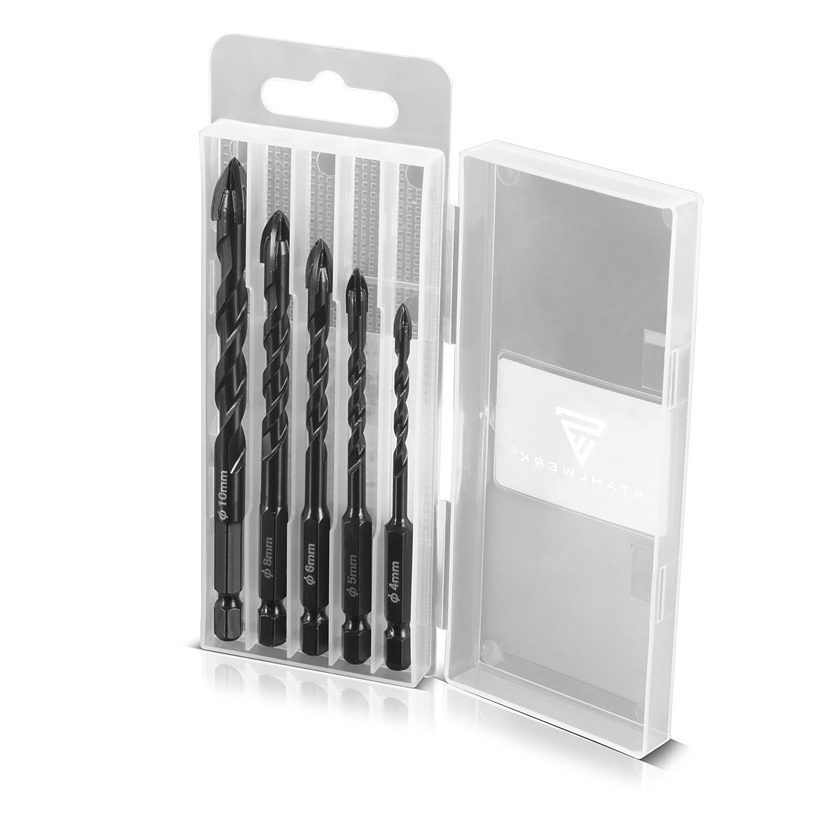 - Vysoce kvalitní sada vrtáků do skla / dlaždic / keramiky / porcelánu STAHLWERK o velikostech 4, 5, 6, 8, 10 mm je ideální pro přesné vrtání do skla, dlaždic, keramiky, porcelánu, slinku, jemné kameniny, mramoru atd.