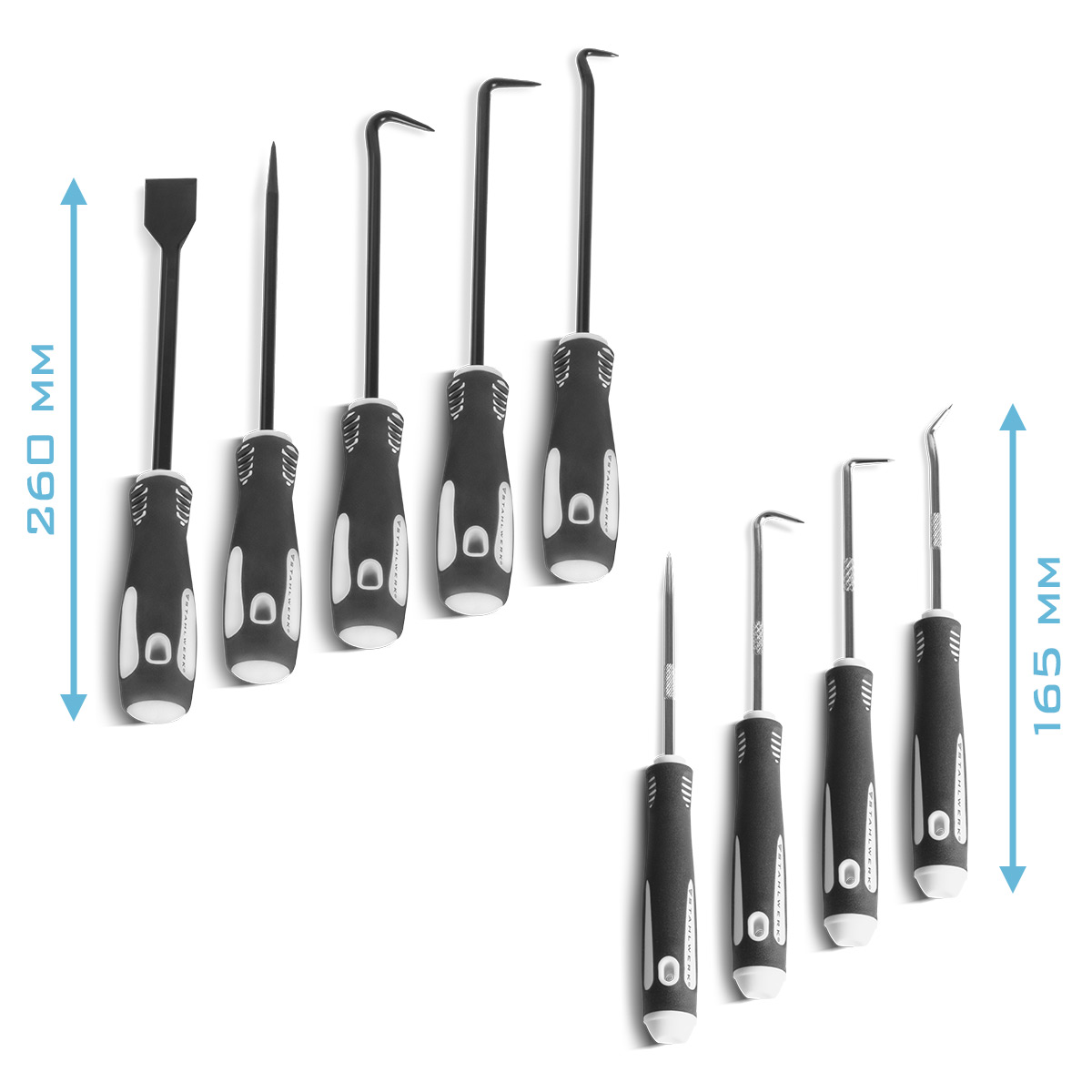 - Sarja sisältää koukkutyökaluja, joissa on eri kulmat ja kärkigeometriat. Siinä on viisi isompaa työkalua, mukaan lukien suora hakanen, kaarevat koukut (45° ja 90°) ja kaavin, sekä neljä pienempää, samankaltaisen muotoista tarkkuuskoukkua hienoihin töihin.
