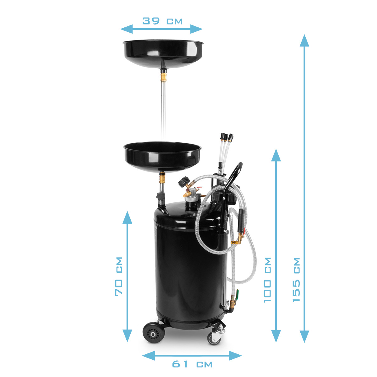 - Díky velké kapacitě 70 litrů je zařízení ideální pro bezpečné shromažďování, přepravu a skladování motorového a převodového oleje. Výškově nastavitelnou sběrnou nálevku lze flexibilně přizpůsobit různým typům vozidel od 100 cm do 155 cm.