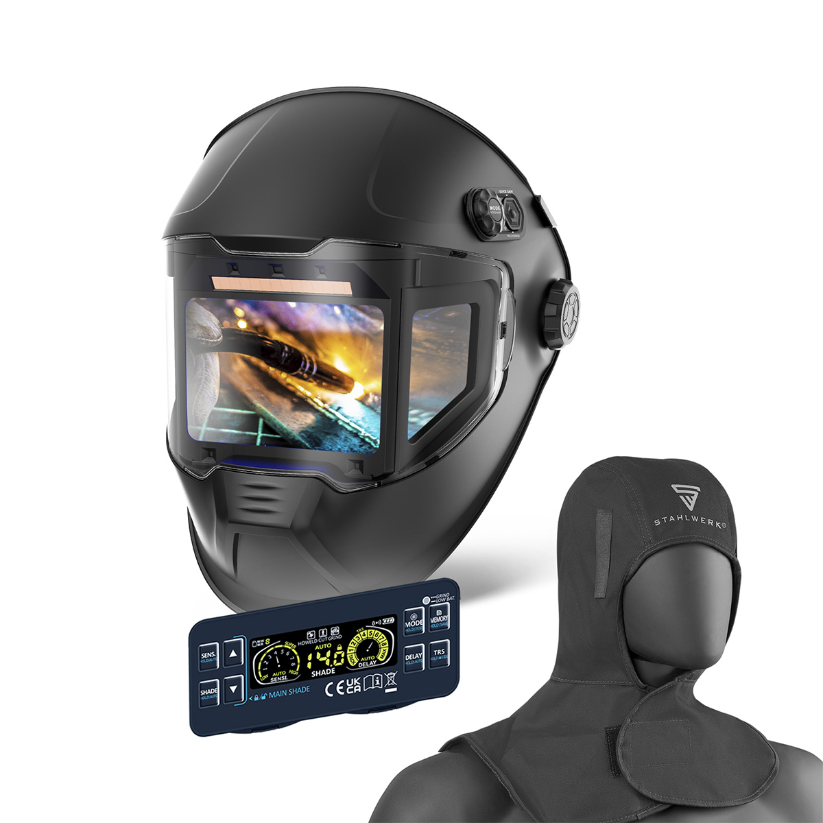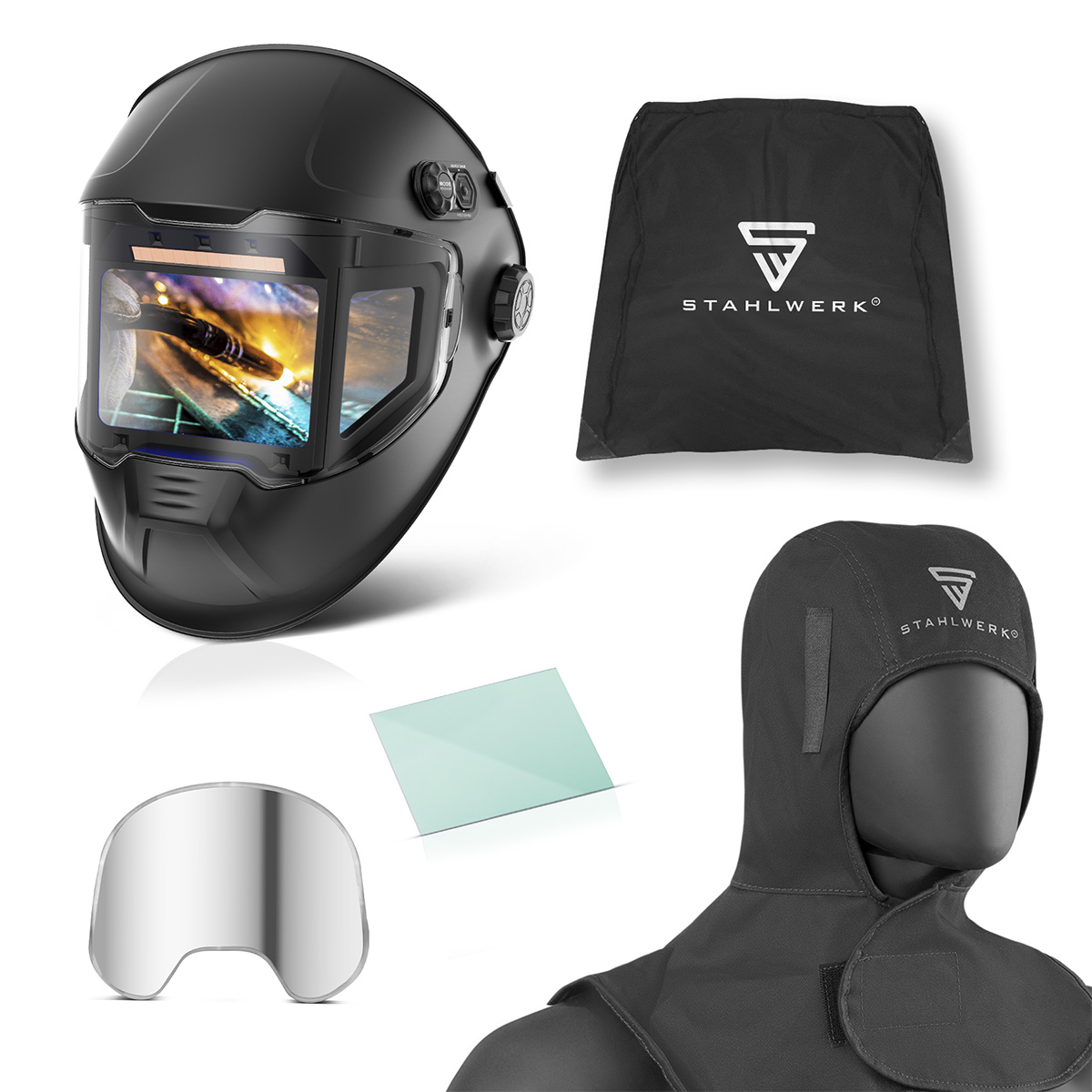 - In addition to the automatic welding helmet, the set includes a heat-resistant welding hood that protects against slag, welding spatter, sparks and flames. It is flame-retardant, temperature-resistant and reduces heat transfer. The robust material and reinforced seams ensure durability and comfort.