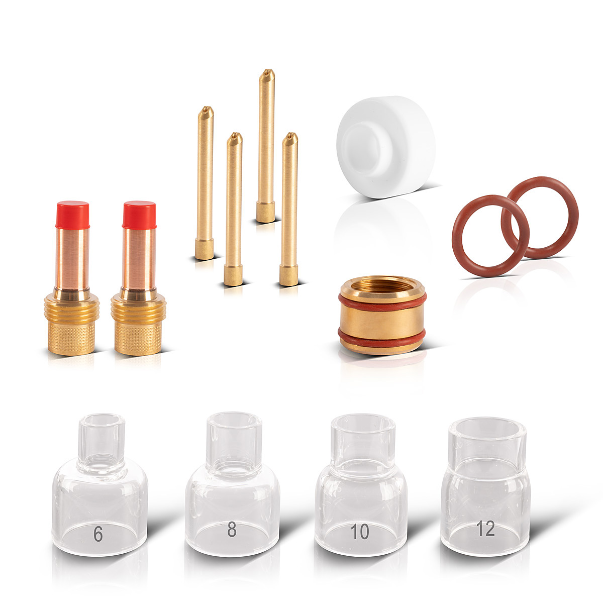 - Im Verschleißteile-Set enthalten sind 4 Gasdüsen (jeweils 1 Stück in den Größen 6, 8, 10, 12), 4 Spannhülsen (jeweils 2 Stück in den Größen 1,6 und 2,4), 2 Spannhülsengehäuse (jeweils 1 Stück in den Größen 1,6 und 2,4), 1 Schweißbrenner-Isolator, 2 Silikondichtungen sowie ein Glasdüsen-Adapter.