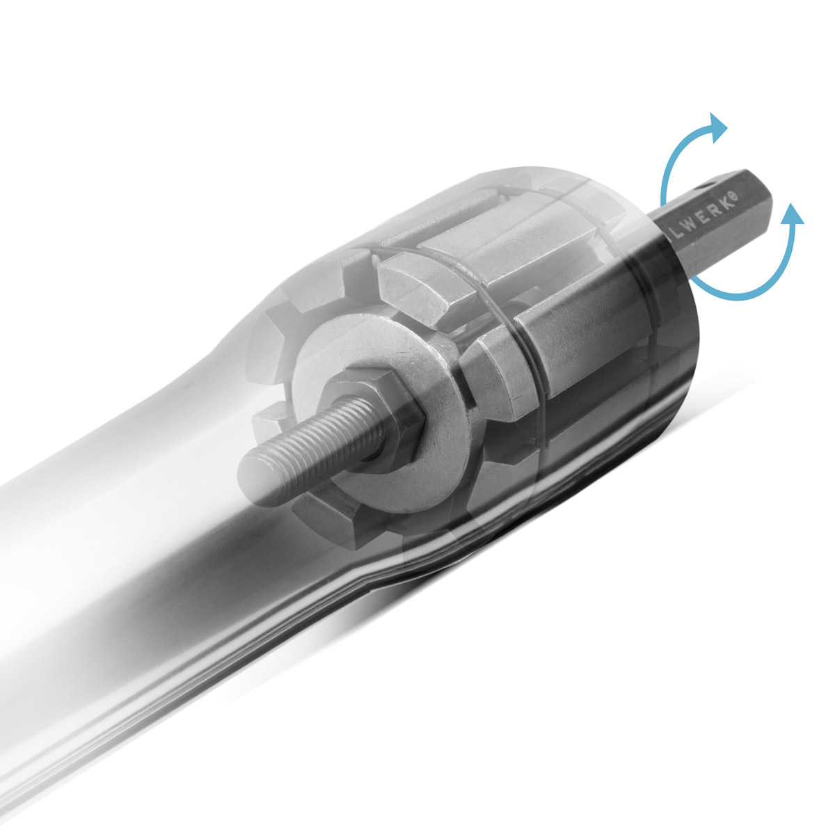 - Monipuolisessa putkenlaajentimessa on 3/4 tuuman kuusiokantainen varsi, ja sitä voidaan käyttää käsisakselin, sorkkaraudan ja myös pneumaattisen tai sähköisen iskuvääntimen kanssa.