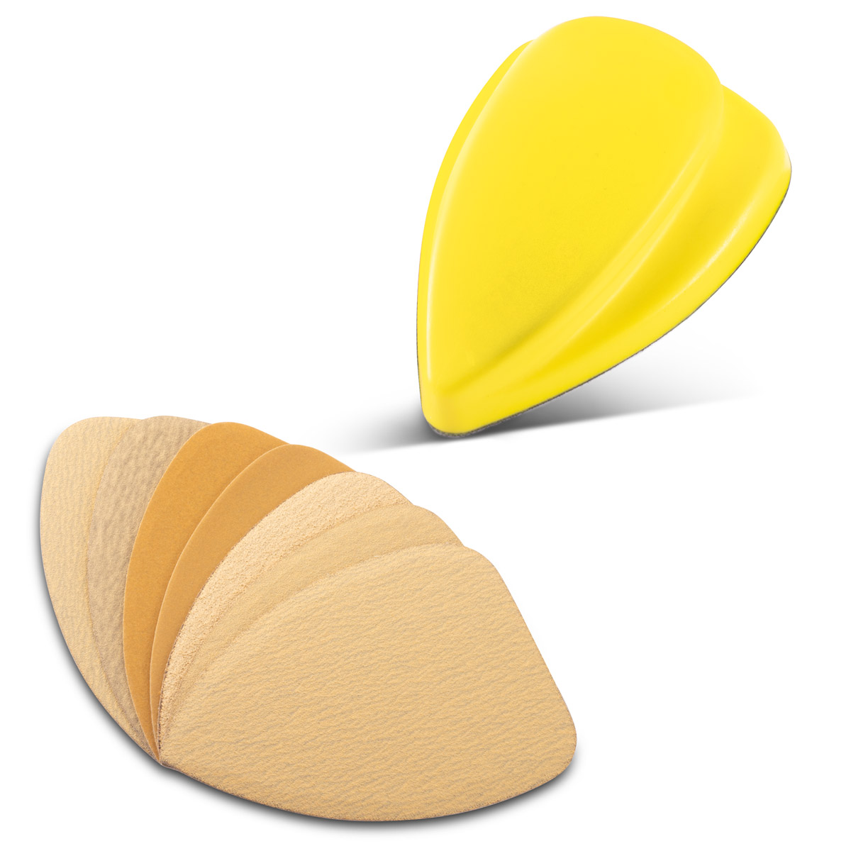 - Las prácticas esponjas de lijado convencen por sus excelentes propiedades de lijado. Gracias a la espuma de PU de resistencia media, la almohadilla de lijado se adapta cómodamente a la mano, se amolda perfectamente a la pieza de trabajo y garantiza una distribución uniforme de la fuerza.