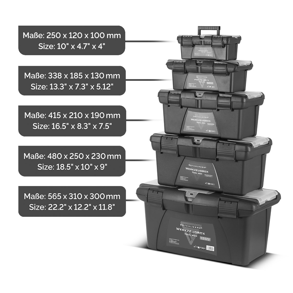 - Værktøjskasserne er fremstillet af PP-plast af høj kvalitet og er ekstremt robuste, holdbare og meget modstandsdygtige.