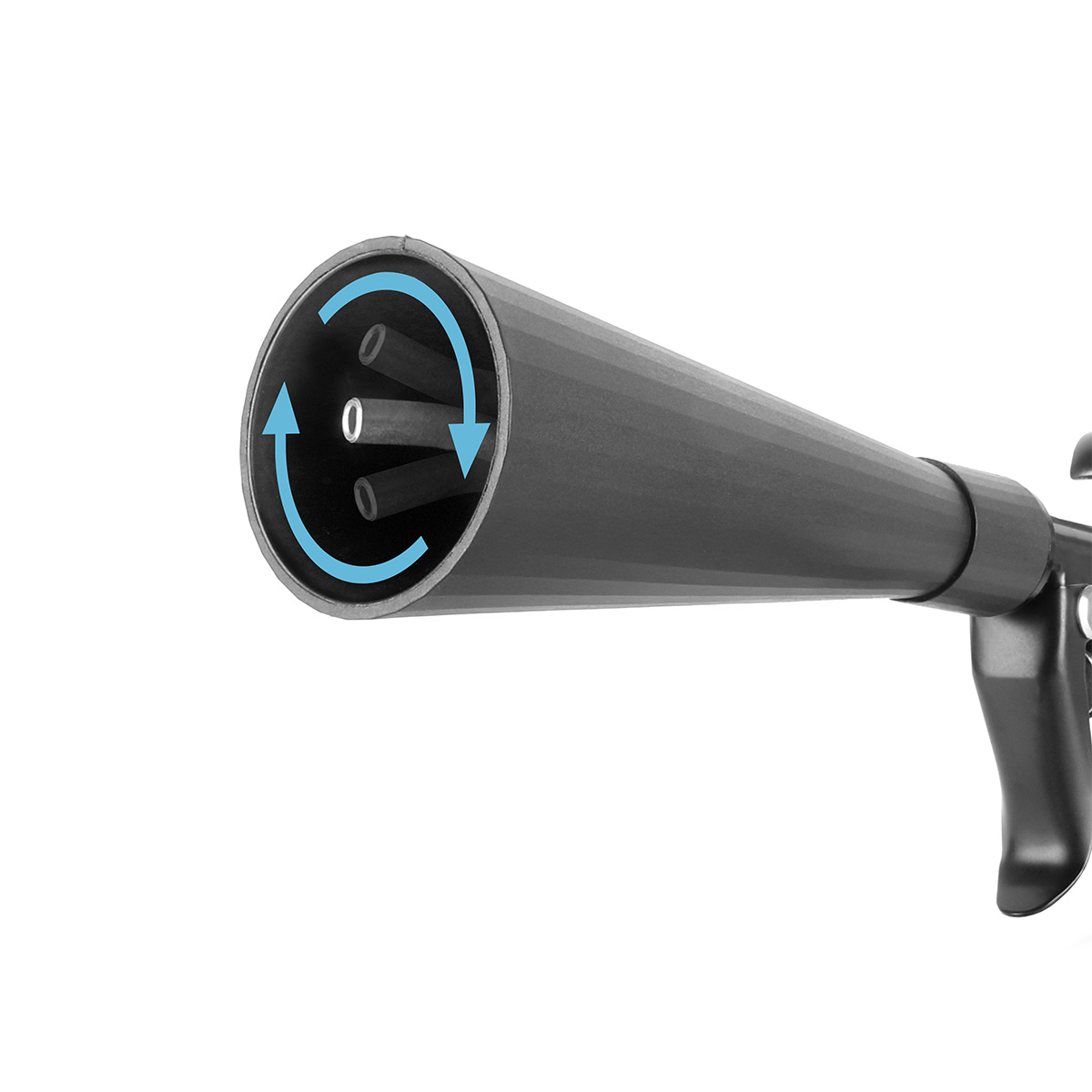 - L'ugello integrato in ottone con cuscinetti a sfera genera un potente flusso d'aria a spirale che rimuove senza fatica anche lo sporco più ostinato grazie all'effetto tornado. Non sono necessari detergenti aggiuntivi.