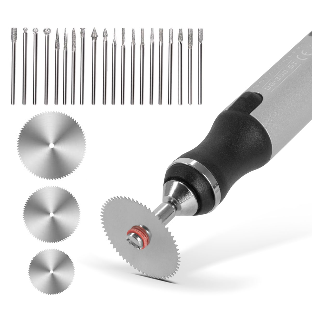 - Le dime in dotazione offrono numerose possibilità di progettazione. Il set di incisione comprende anche tre dischi da taglio in acciaio inox.