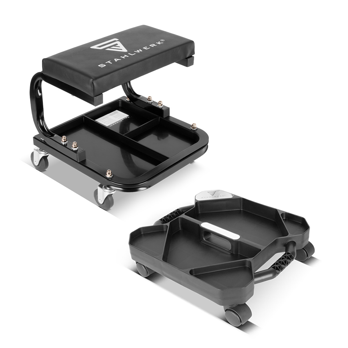 - 2-teiliges Werkstatt- und Kfz-Montage-Set, das einen belastbaren Werkstatthocker mit einem kompakten Werkzeug-Caddy für effiziente Wartungs-, Reparatur- und Montagearbeiten kombiniert.