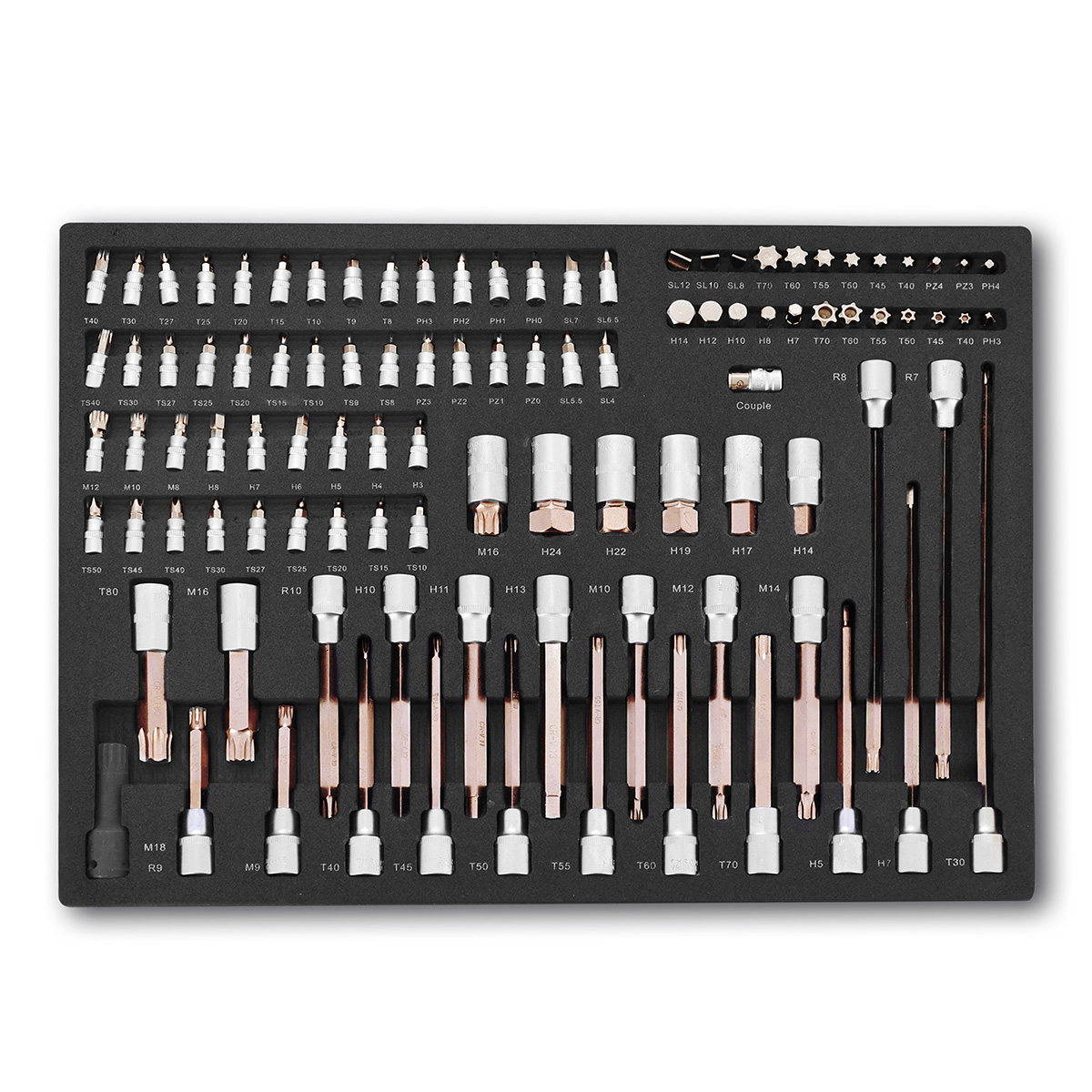 - 1 x skumindsats med 102-delt topnøgle- og bitsæt