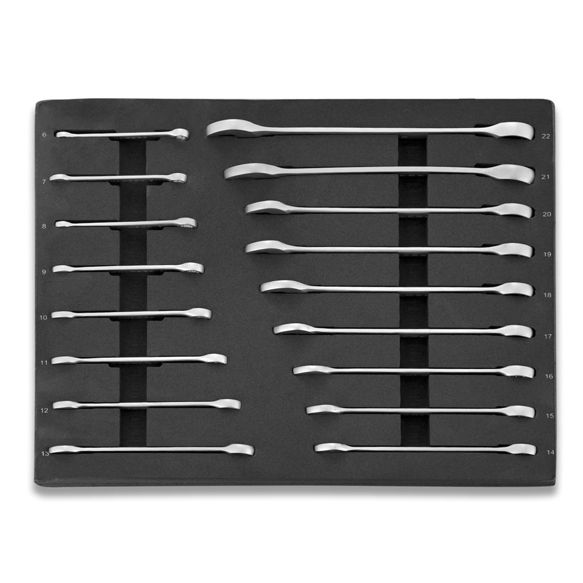 - Det omfattende ring- og gaffelnøglesæt leveres i en matchende skumindsats til værkstedsvogne.