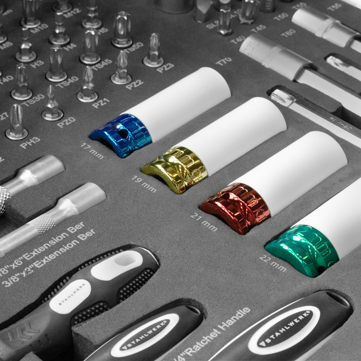 - Cztery oznaczone kolorami nasadki 17 mm, 19 mm, 21 mm i 22 mm z napędem kwadratowym 1/2 cala do śrub z łbem sześciokątnym nadają się do odkręcania kół za pomocą klucza do nakrętek kół, klucza dynamometrycznego lub klucza udarowego. Kompleksową gamę narzędzi uzupełnia precyzyjny klucz dynamometryczny o zakresie pomiarowym 20-210 Nm.