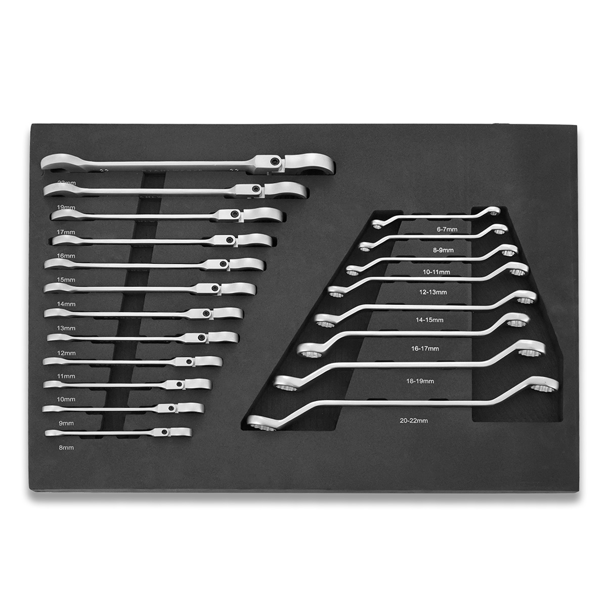 - Det omfattende ring- og gaffelnøglesæt leveres i en passende indsats til værkstedsvogne. Ideel til kommerciel brug i industri, handel, bilindustrien og hjemmeværkstedet.
