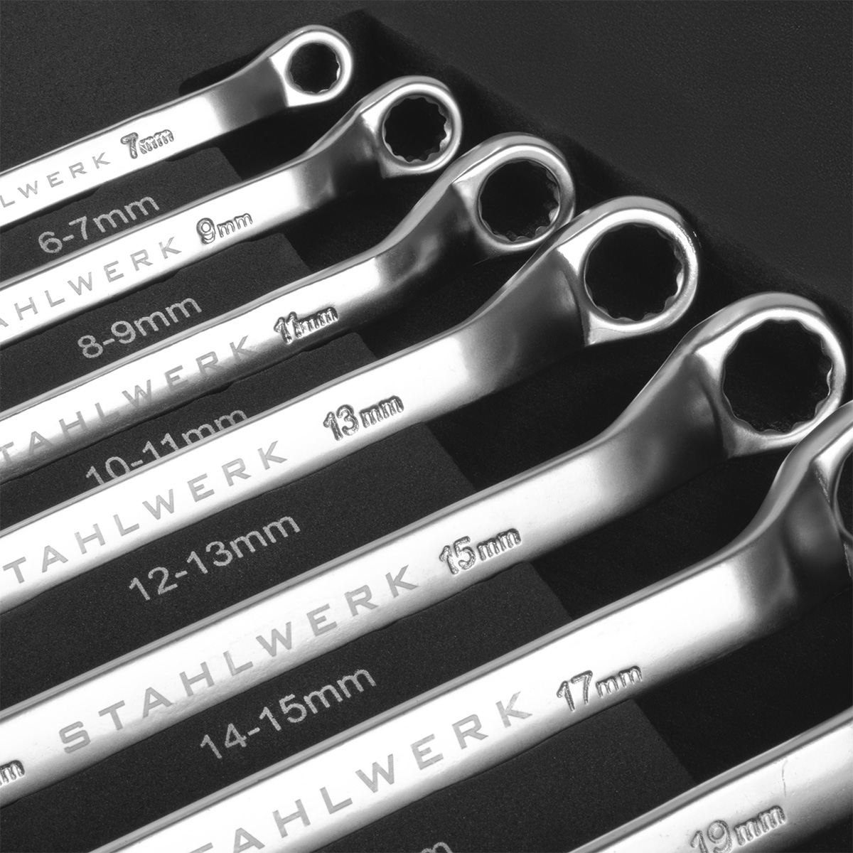 - 8 x ringnyckelsats vinklad: 6-7, 8-9, 10-11, 12-13, 14-15, 16-17, 18-19, 20-22 mm