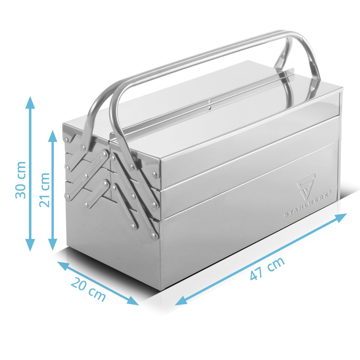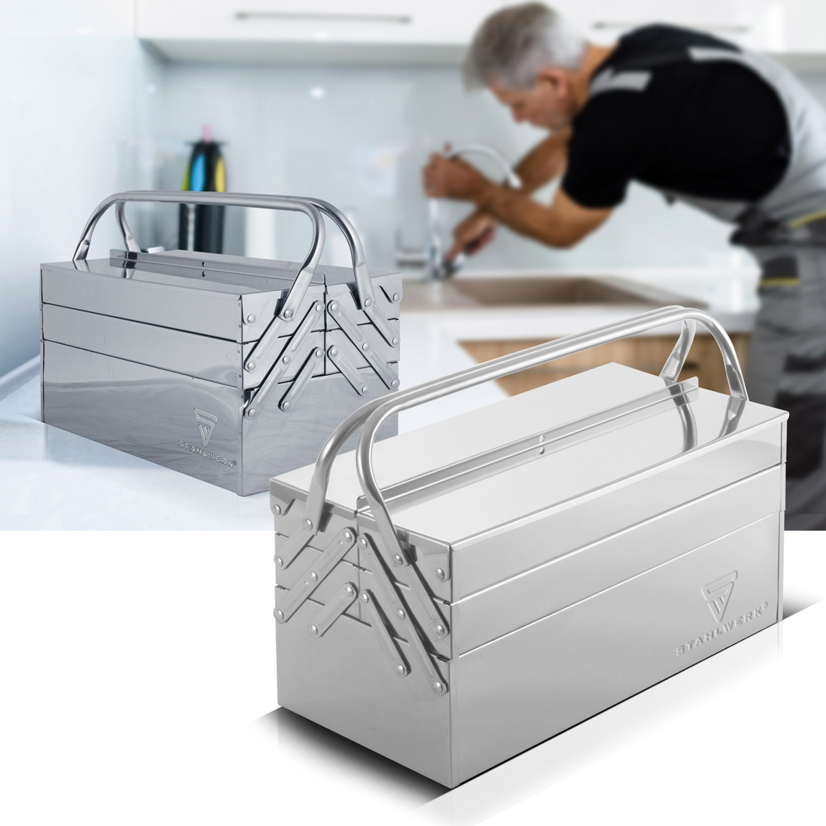 - STAHLWERKin ruostumattomasta teräksestä valmistettu työkalulaatikko tekee vaikutuksen yksinkertaisella muotoilullaan, kätevällä ja tilaa säästävällä kuljetuksella sekä työkalujen selkeällä järjestämisellä.