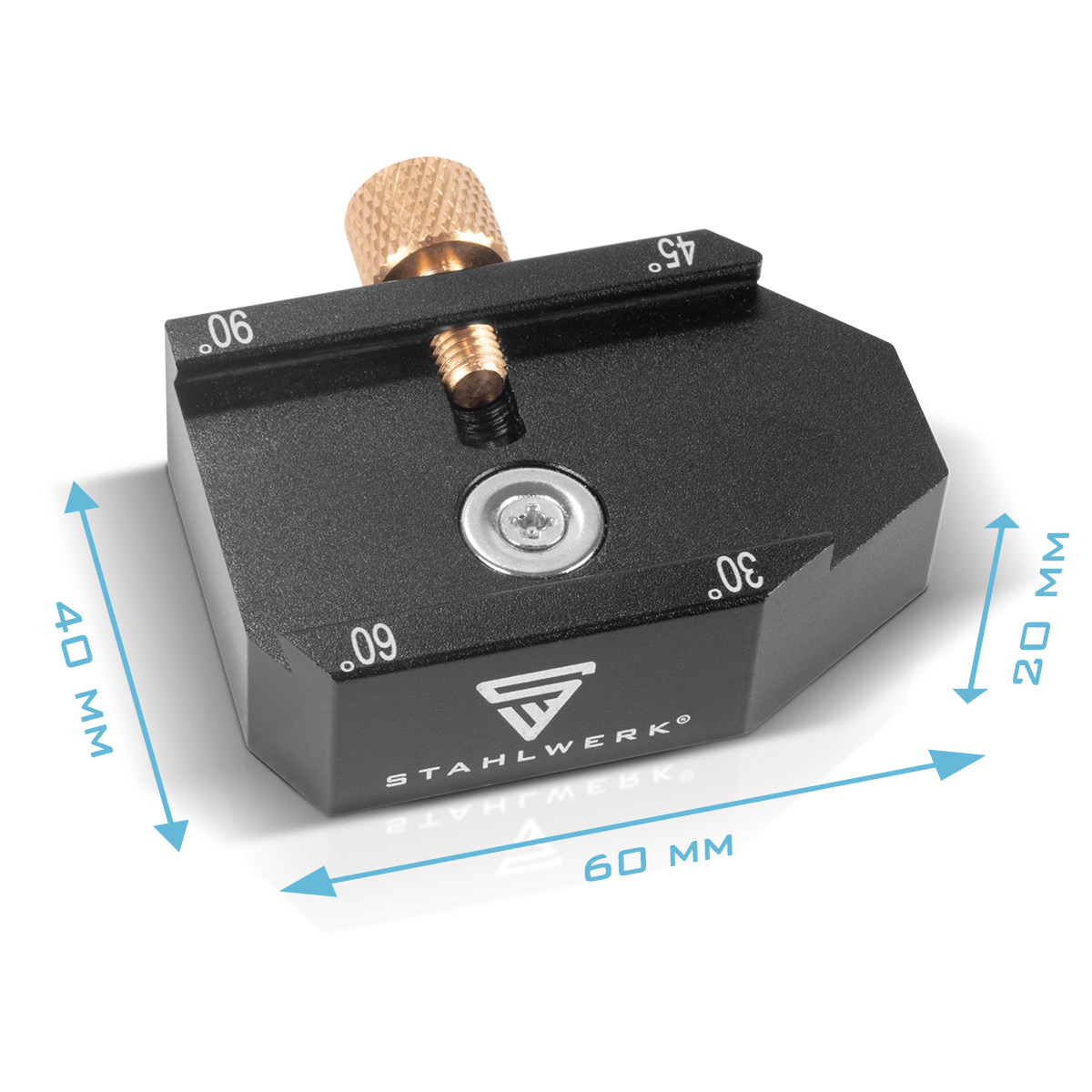 - Variabilní doraz lze rychle nastavit na požadovaný úhel 30° / 45° / 60° / 90° a přenést na obrobek.