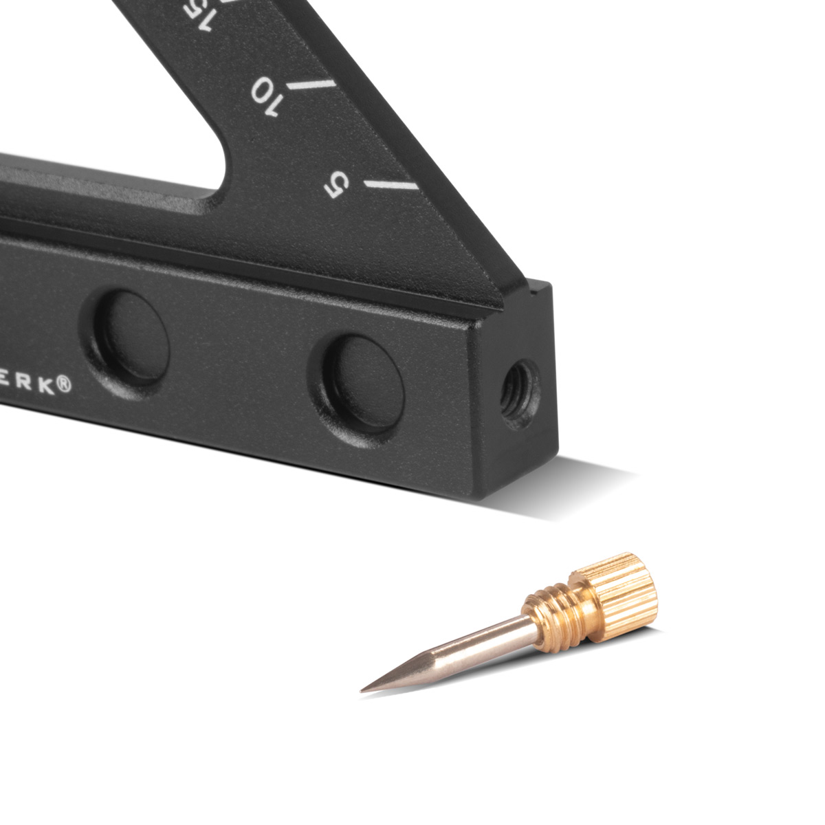 - Il righello angolare ha un pratico arresto ed è dotato di un ago di marcatura.