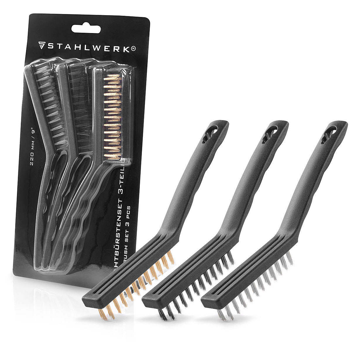 - Tredelad uppsättning trådborstar med en längd på 220 mm (9 tum) bestående av en mässingsborste, en stålborste och en nylonborste för effektiv rengöring av smutsiga ytor.