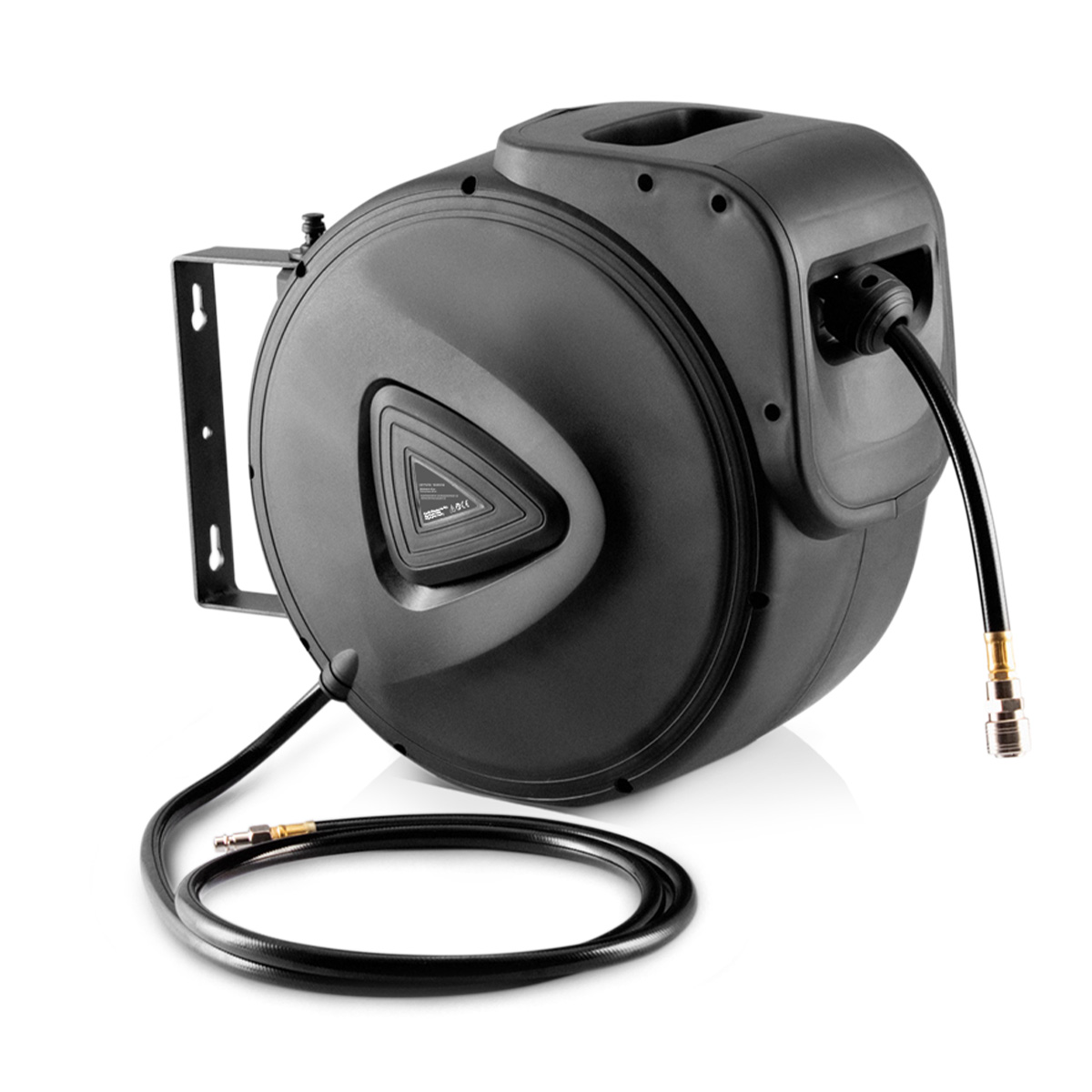 - Ein robustes Kunststoffgehäuse mit ergonomischer Handgriffmulde und leistungsstarker Aufrollautomatik mit Fliehkraftbremse sorgt für Ordnung am Arbeitsplatz und schützt den Druckluftschlauch vor Verschleiß und Beschädigungen. Mit der Arretier-Funktion lässt sich die gewünschte Länge des Schlauchs spielend leicht auswählen.