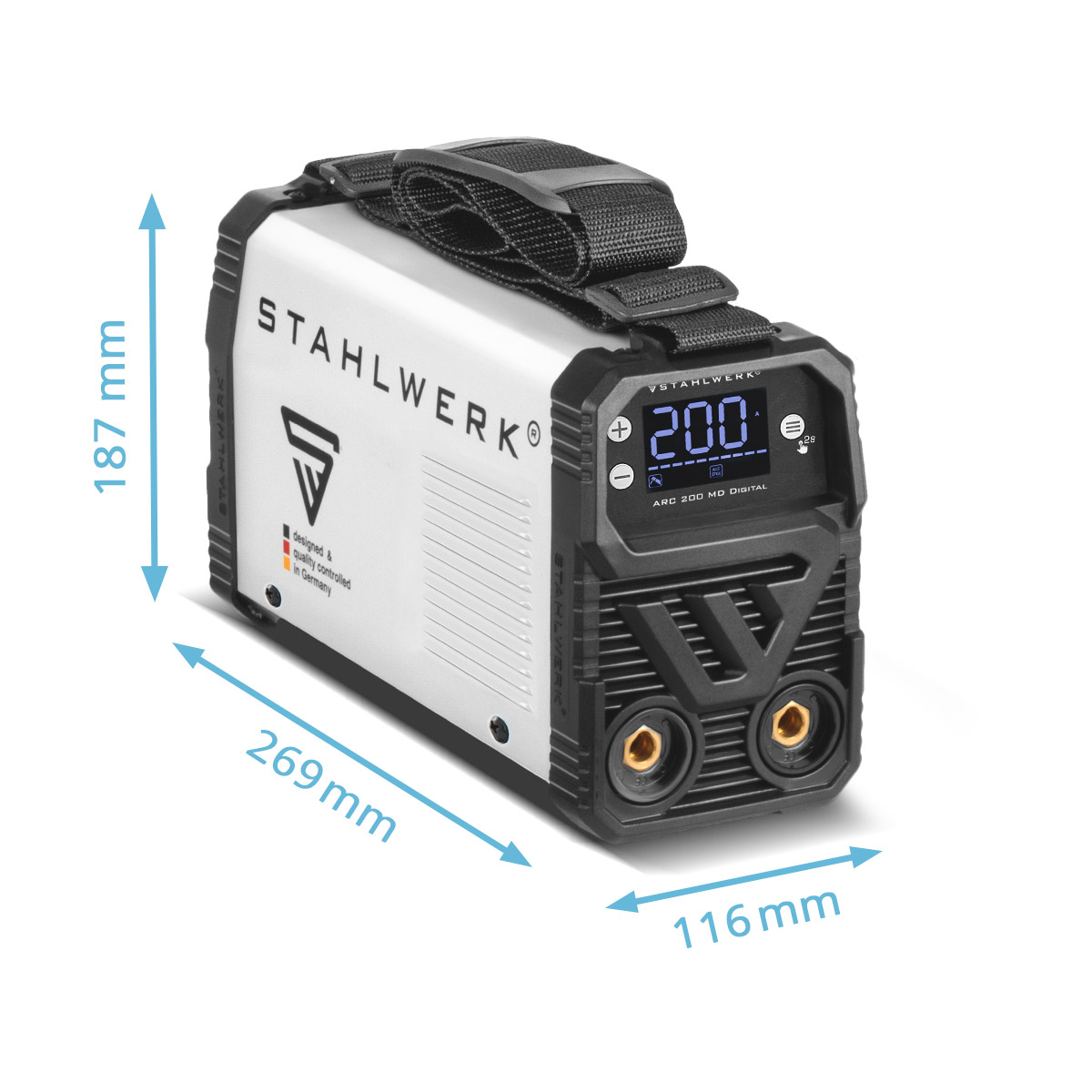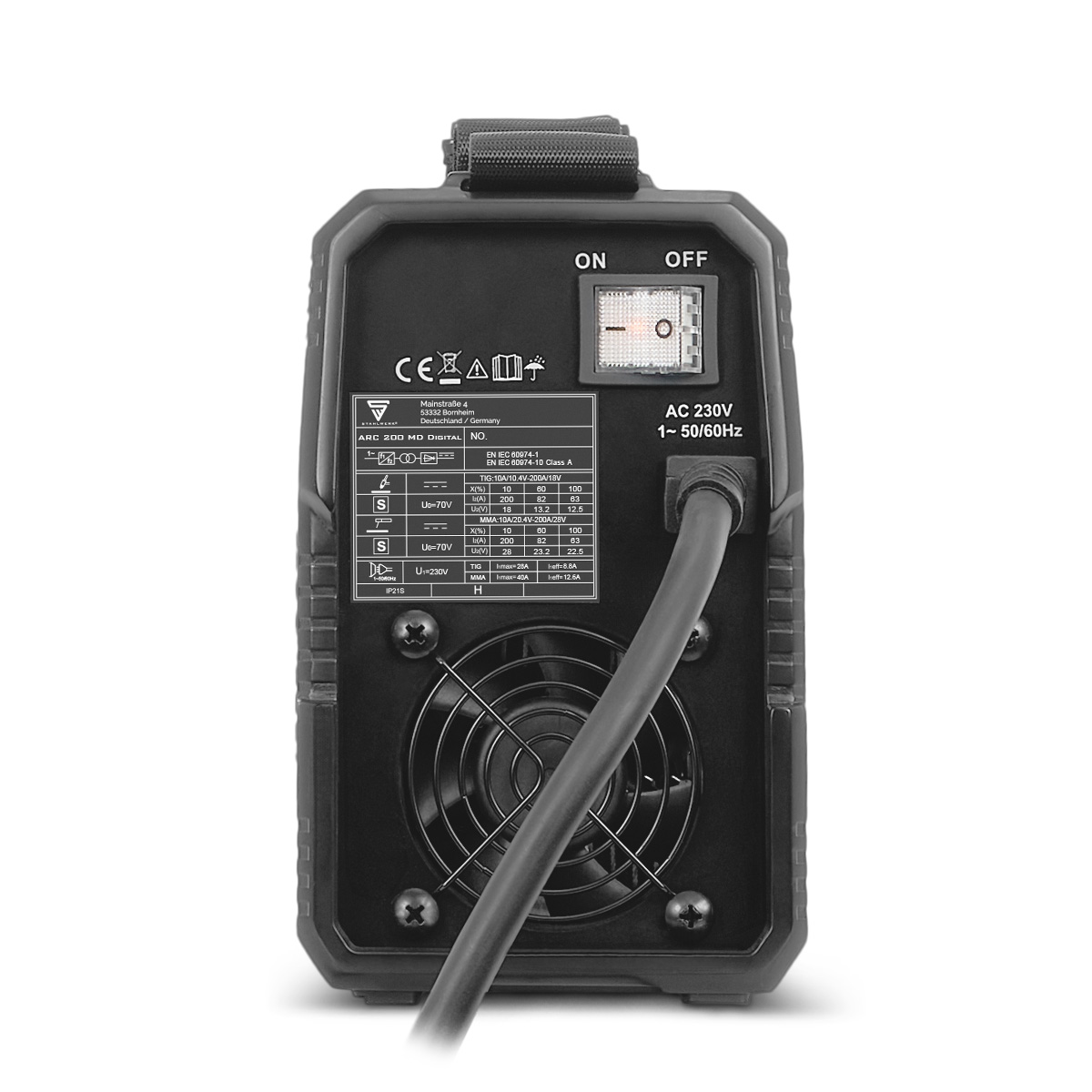 - Svařovací proud a všechny ostatní nastavené parametry jsou snadno čitelné na přehledném digitálním displeji. Svařovací proud lze jednoduše nastavit v rozsahu 10-200 A pomocí ovládacích tlačítek.