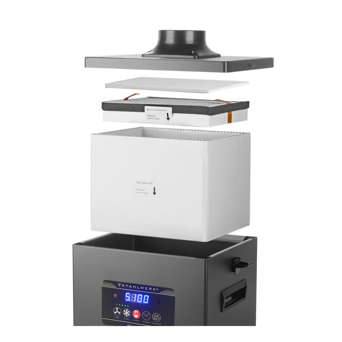 - Praxisorientiertes Ersatzfiltersortiment für die STAHLWERK-Rauchabsaugung FE-150 ST, das drei Vorfilter-Filtermatten als erste Filterstufe mit einem mittleren HEPA-Filter (H13 gemäß EN 1822) zur Partikelfiltration sowie einem Aktivkohle-Hauptfilter zur Schadstoffaufnahme kombiniert.