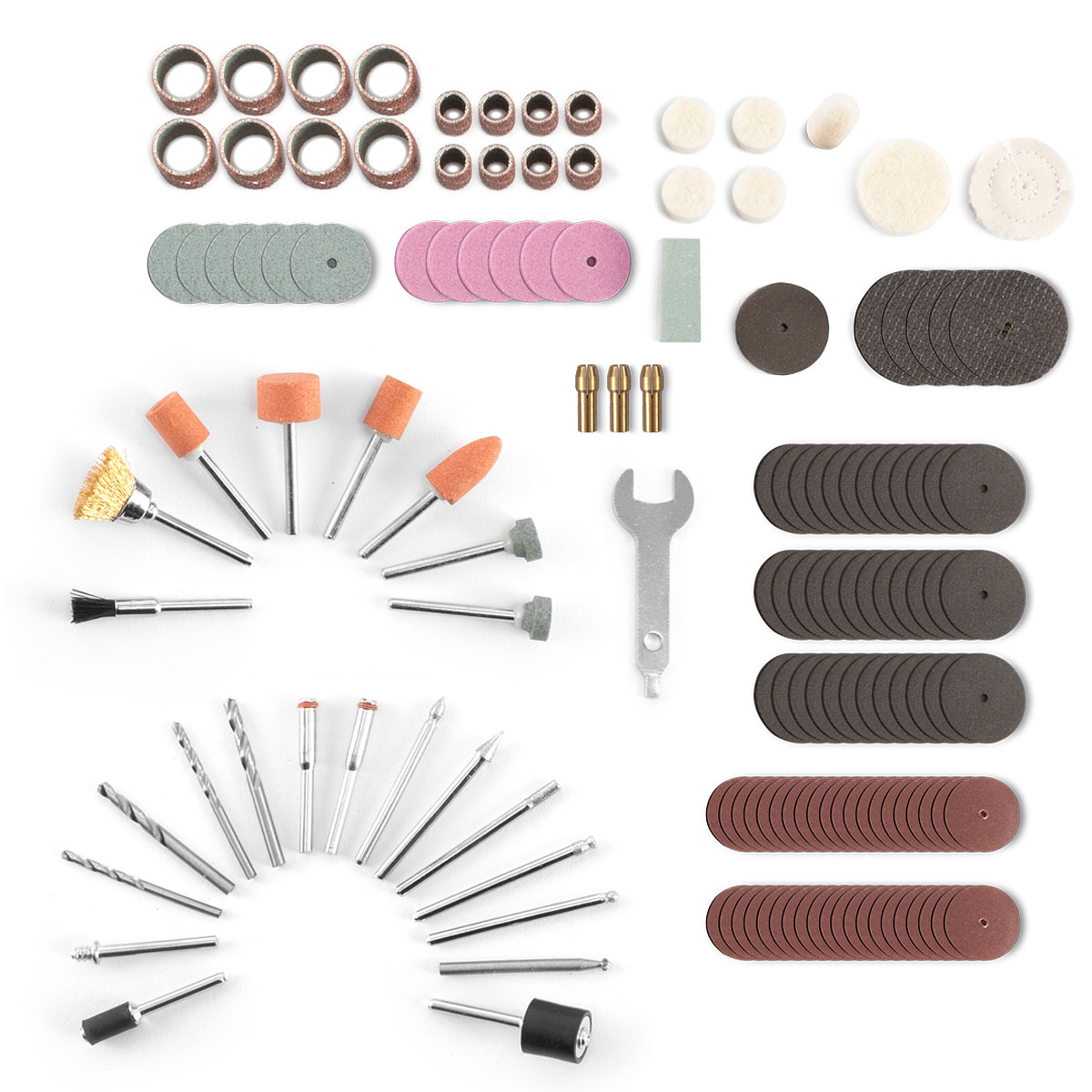 - Kiillotus-/hiontakiekot: 1 x 25 mm kiillotushuopalevy, 8 x 12,4 mm kiillotushuopalevy, 1 x 25 mm kiillotuskiekko, 1 x 10 mm kiillotuspää, 6 x 19,7 mm karkeat hiomalaikat, 6 x 19,7 mm hienot hiomalaikat, 36 x 0,7 mm 24,3 mm halkaisijaltaan olevat leikkuulaikat, 65 x 19 mm halkaisijaltaan olevat hiomapaperilevyt.