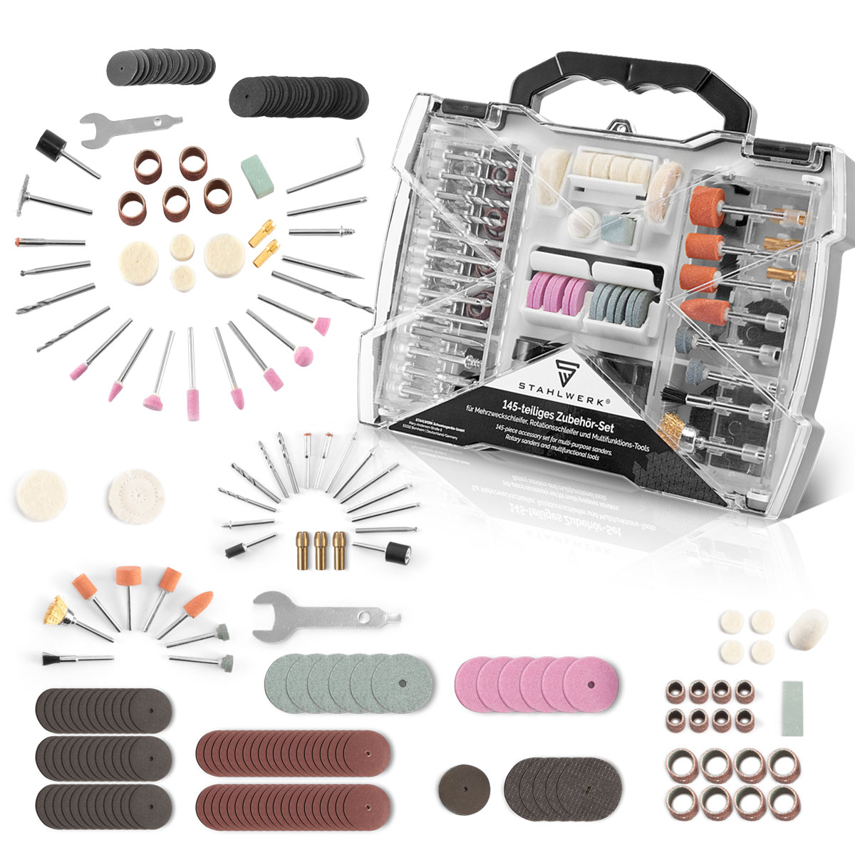 - Ensimmäinen sarja, jossa on 80 osaa, tarjoaa kaikki olennaiset työkalut STAHLWERK MF130-ST -monitoimihiomakoneeseen sekä muihin rotaatiohiomakoneisiin ja monitoimityökaluihin, joissa on enintään 3,2 mm:n työkaluvarsi.