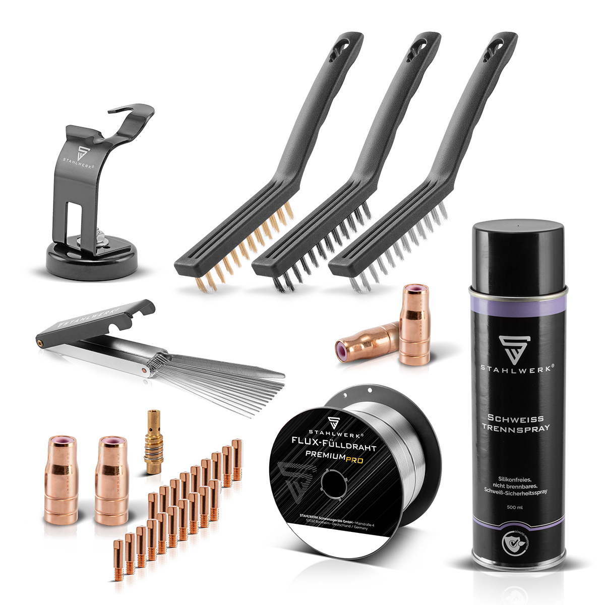 - Satsen kompletteras med en FLUX trådrulle (0,9 mm) och en silikonfri, icke brandfarlig svetsspray. Sprayen skyddar mot att svetssprut fastnar och ger en hög separationseffekt tack vare en fin emulsionsfilm.