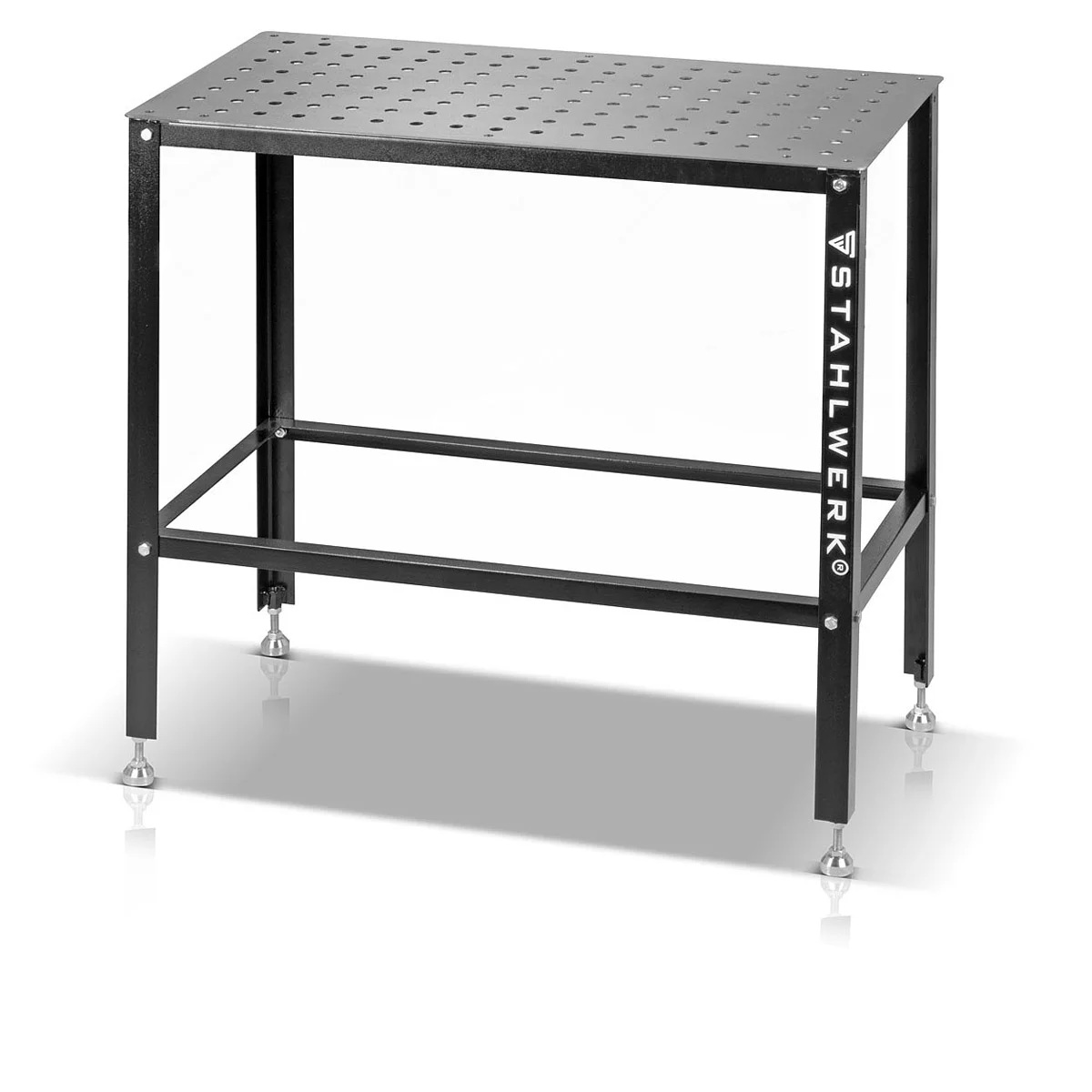 - Stół spawalniczy/montażowy STAHLWERK jako zestaw do samodzielnego montażu z blatem roboczym o grubości 3 mm wykonanym z wytrzymałej stali węglowej zapewniającej wysoką stabilność i nośność.