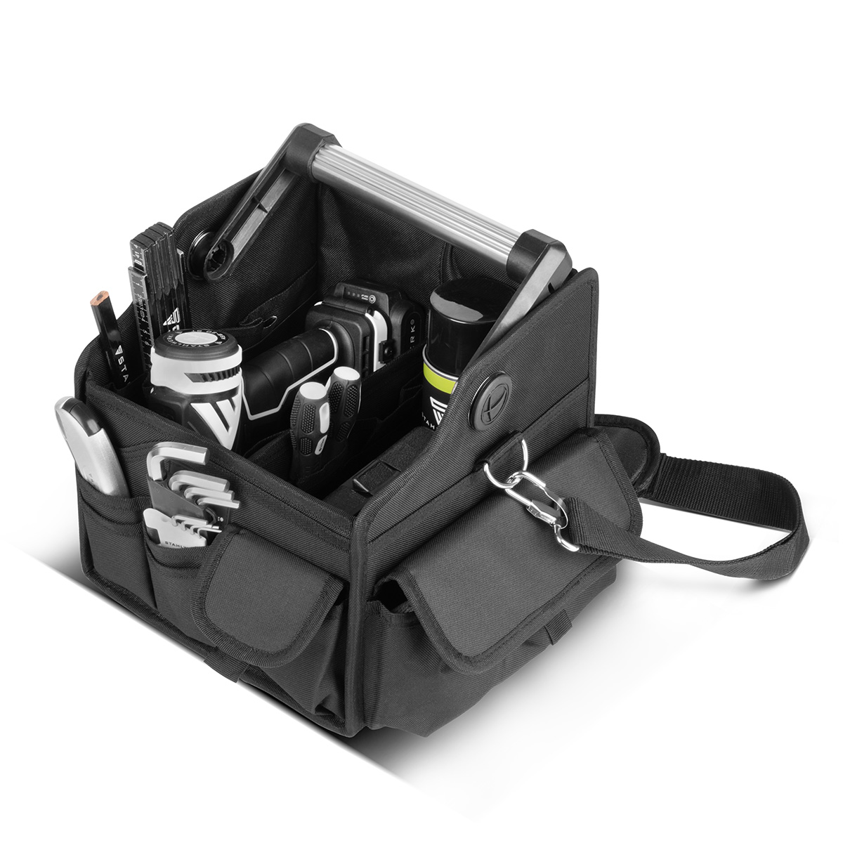 - Die hochwertige Profi-Werkzeugtasche mit Aluminiumgriff bietet viel Platz und schnellen Zugriff auf Werkzeuge und Kleinteile. An einem praktischen Tape-Holder lassen sich Maßbänder und andere Werkzeuge einfach fixieren, sodass sie stets griffbereit sind.