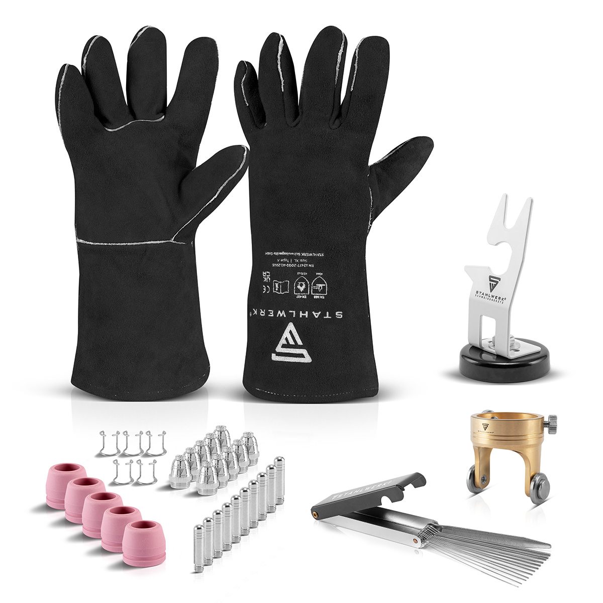 - Součástí sady jsou ochranné rukavice proti teplu z hovězí štípané kůže pro bezpečnost práce (osobní ochranné prostředky podle normy EN 12477). Rukavice jsou určeny pro vysoké tepelné a mechanické zatížení a doporučují se zejména při silném rozstřikování/kropení (např. při plazmovém řezání).