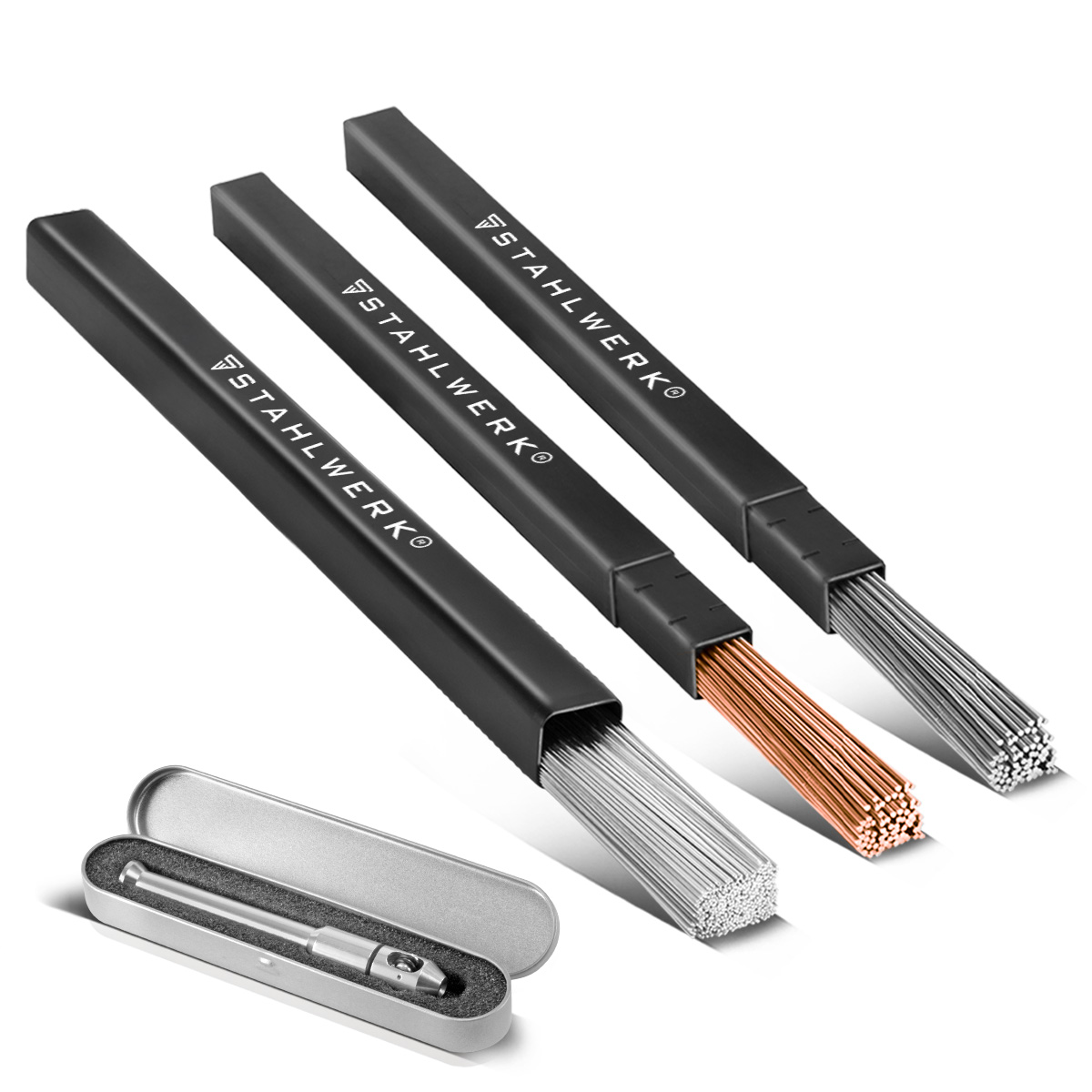 - Praktisches Set mit WIG-Schweißstäben und TIG-Pen, dass alle drei gängigen WIG-Zusatzwerkstoffe für Stahl, hochlegierten Edelstahl und Aluminium kombiniert. Alle Zusatzwerkstoffe bilden bei der Verarbeitung ein zähflüssiges, gut beherrschbares Schmelzbad, das ein effizientes Schweißen ermöglicht.