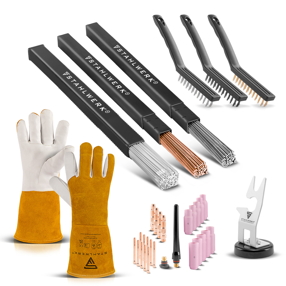 - Praktische TIG-accessoireset met praktische producten voor dagelijks lassen: een veilige toortshouder, een set voor oppervlaktereiniging, handbescherming en 26 TIG-slijtdelen, evenals drie dozen met TIG-lasstaven (aluminium, staal, roestvrij staal) met een diameter van 2,4 mm als reserve.