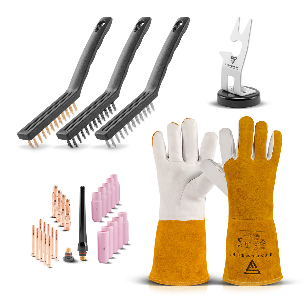 - Praktická sada příslušenství TIG obsahuje čtyři užitečné produkty pro každodenní svařování: bezpečný držák hořáku, sadu pro čištění povrchu, ochranu rukou a náhradní opotřebitelné díly TIG.